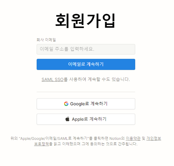 노션의 메인페이지를 확인해보면 다음과 같습니다. 오른쪽 상단의 "무료로 노션 사용하기" 버튼을 눌러 회원가입을 진행하면 됩니다. 일반적으로 구글 계정을 가지고 있으시다면 "구글로 계속하기"를 이용하면 편리합니다.